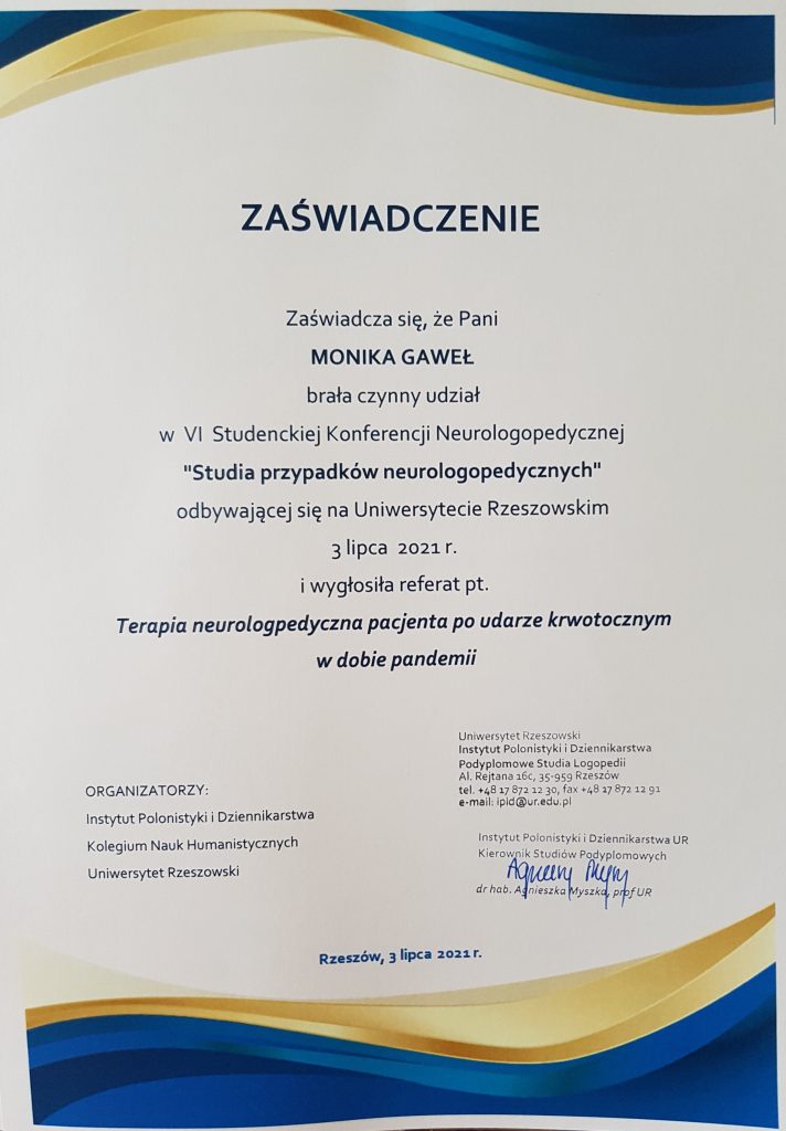 „Pani mgr Monika Gaweł, neurologopeda, specjalista terapii osób po udarze mózgu, współpracuje z czasopismem Sprawny umysl. Witalne ciało. Jest to ogólnopolski miesięcznik wydawnictwa Wiedza i Praktyka, dział: Zdrowie w praktyce. Pani Monika jest specjalistą, profesjonalnie przedstawiającą zarówno teorię, jak i praktykę zagadnień, by w jak największym stopniu pomóc naszym czytelnikom: pacjentom neurologicznym oraz ich rodzinom. Dlatego jest dla nas cennym współpracownikiem.”